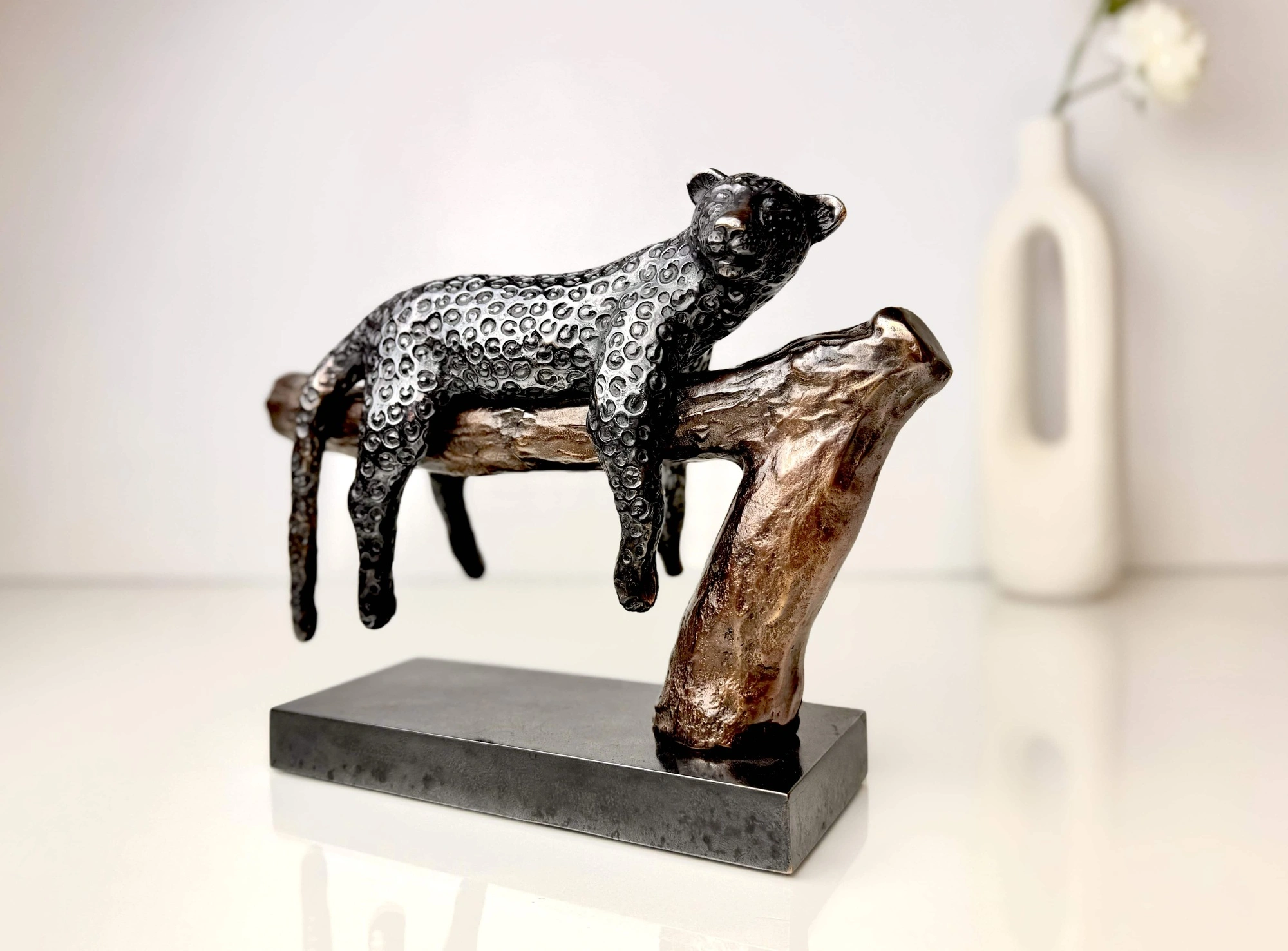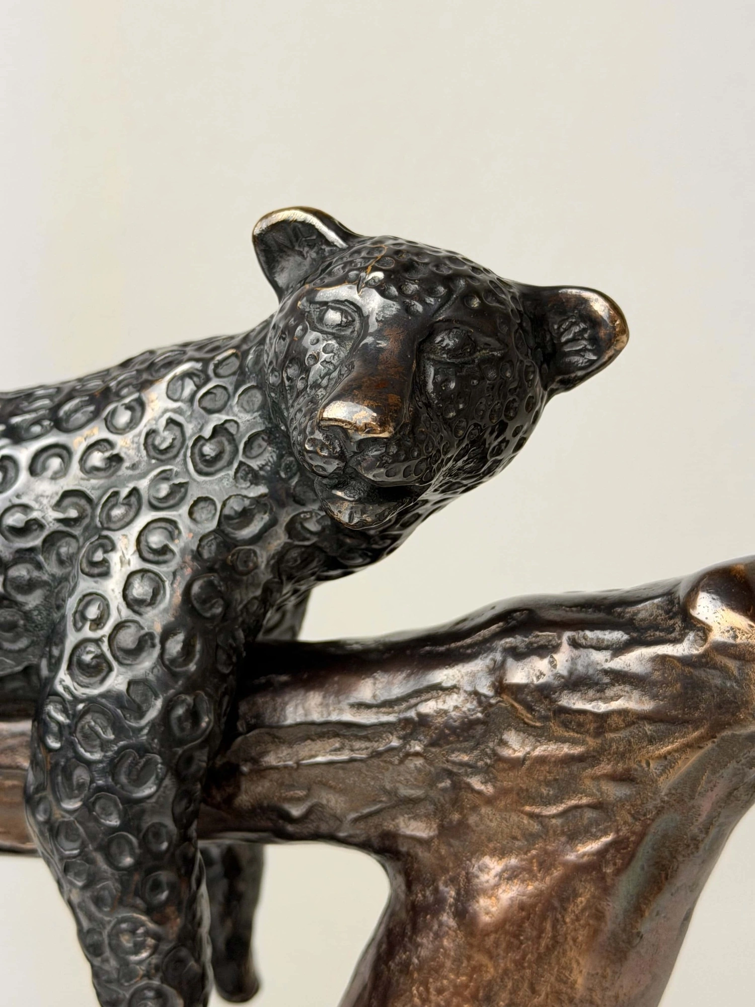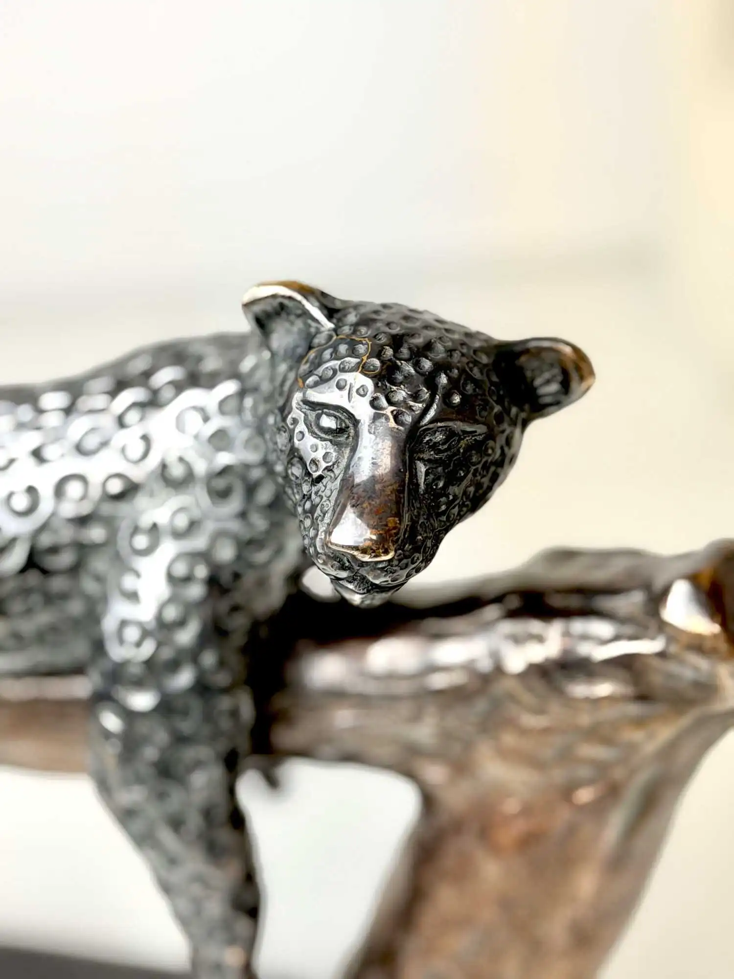 Leoparden fås i smukt, højpoleret med mørke skygger i pletterne, eller i helt sortpatineret.