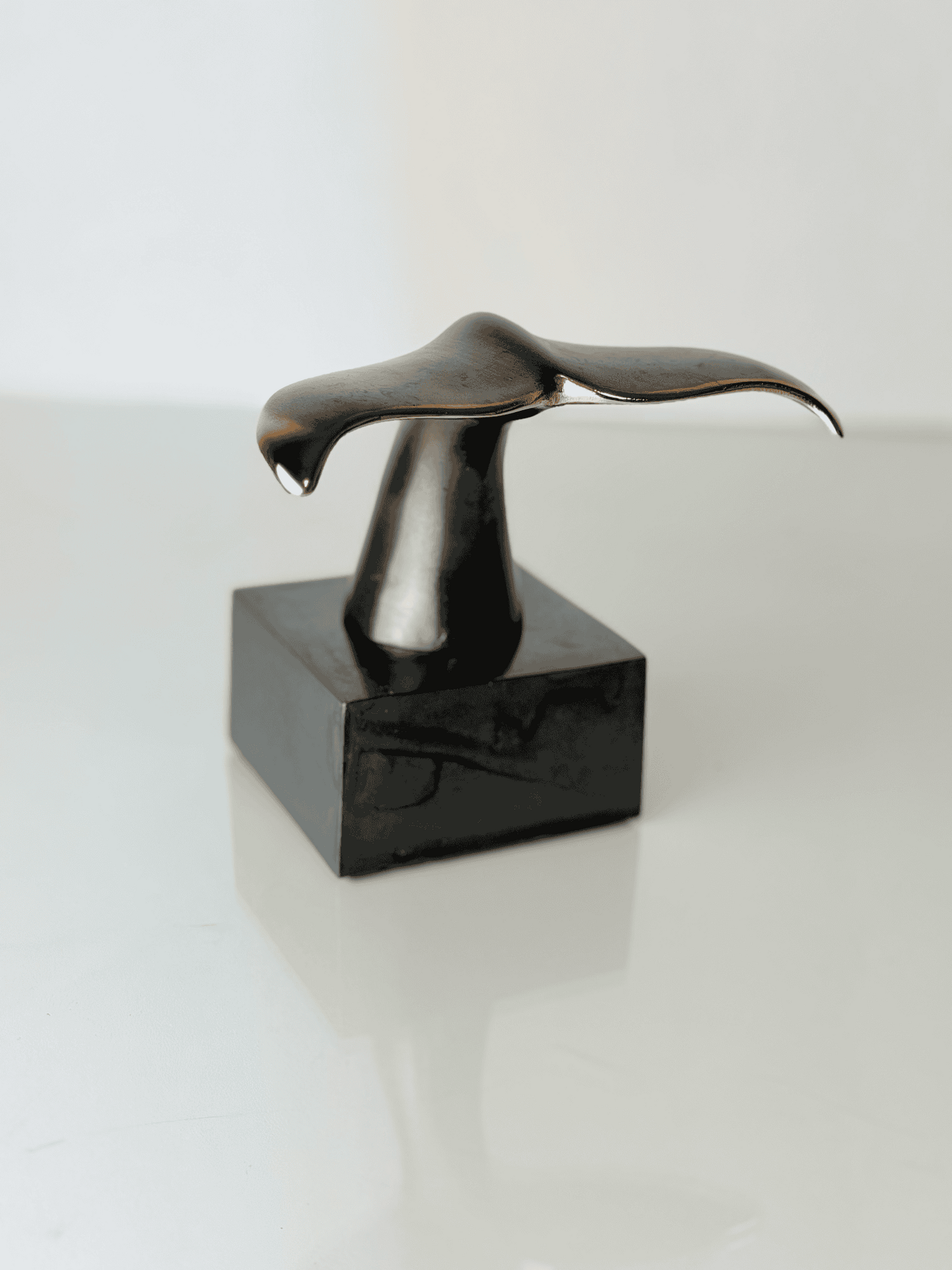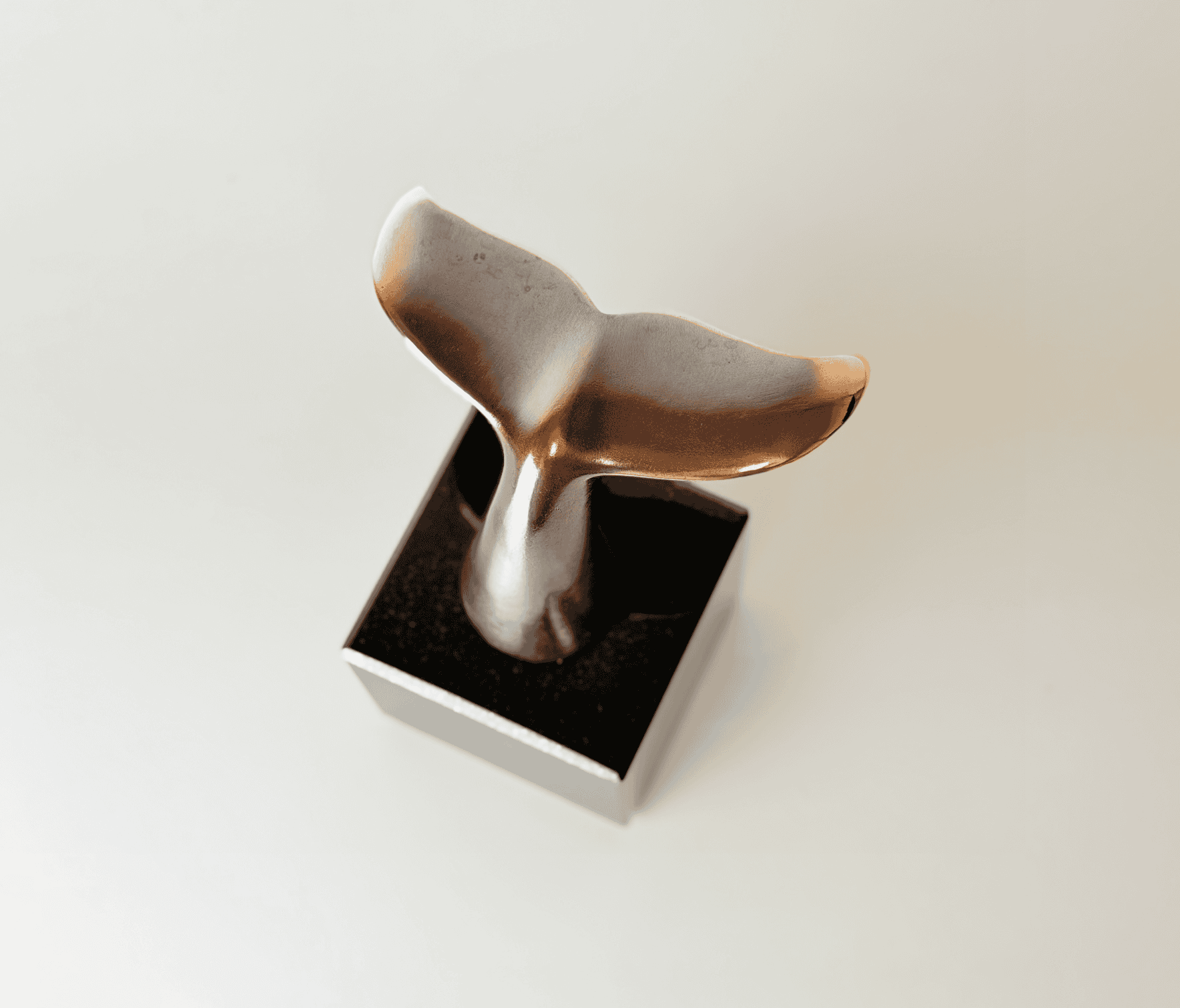 Whale tail in bronze on corresponding square base of polished, black granite by Stiig Kalsing.