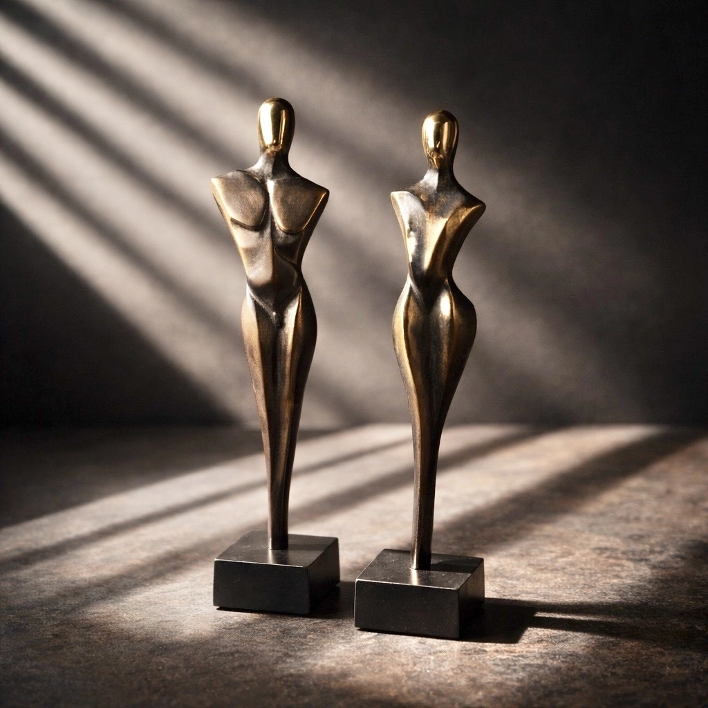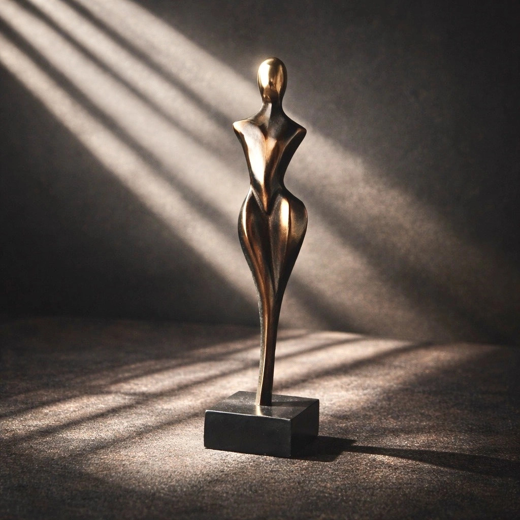 The sculpture is made of solid, dark patinated bronze with fine polished details and is mounted on a dark patinated, square, bronze plinth.