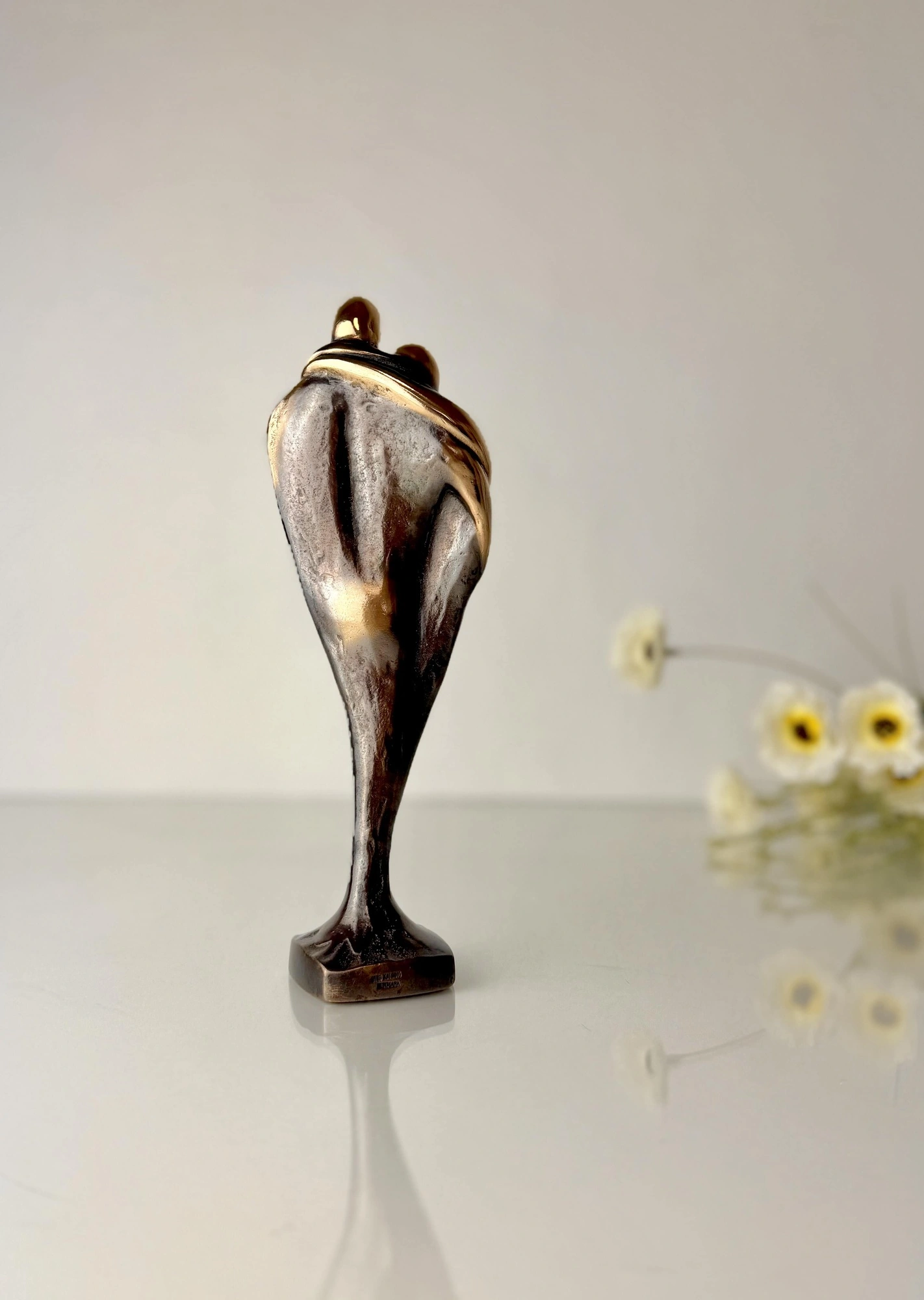 Skulpturen er af massiv, bruneret bronze med flotte polerede detaljer.