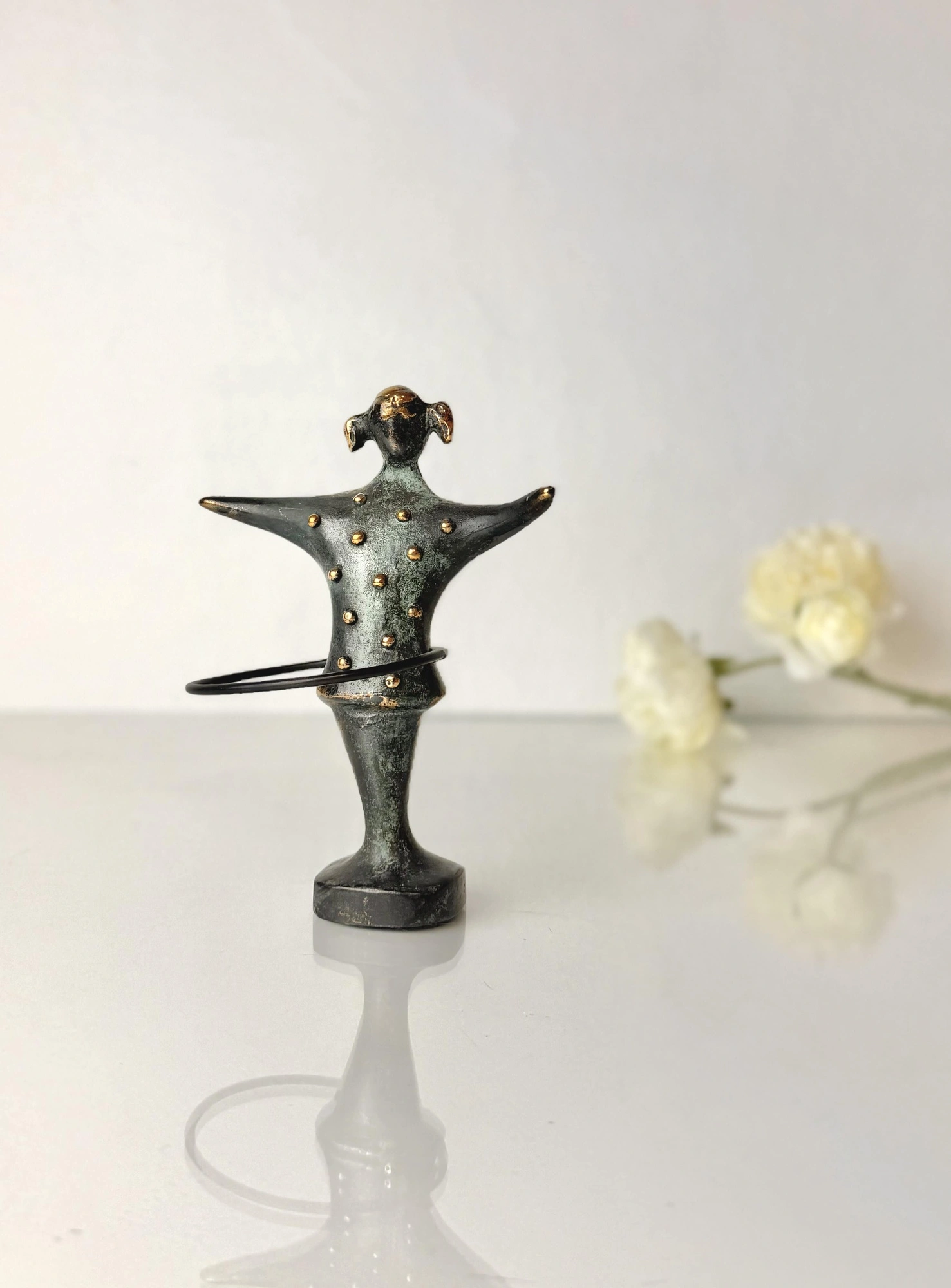 Den er af massiv, bruneret og grønpatineret bronze med smukke polerede detaljer.