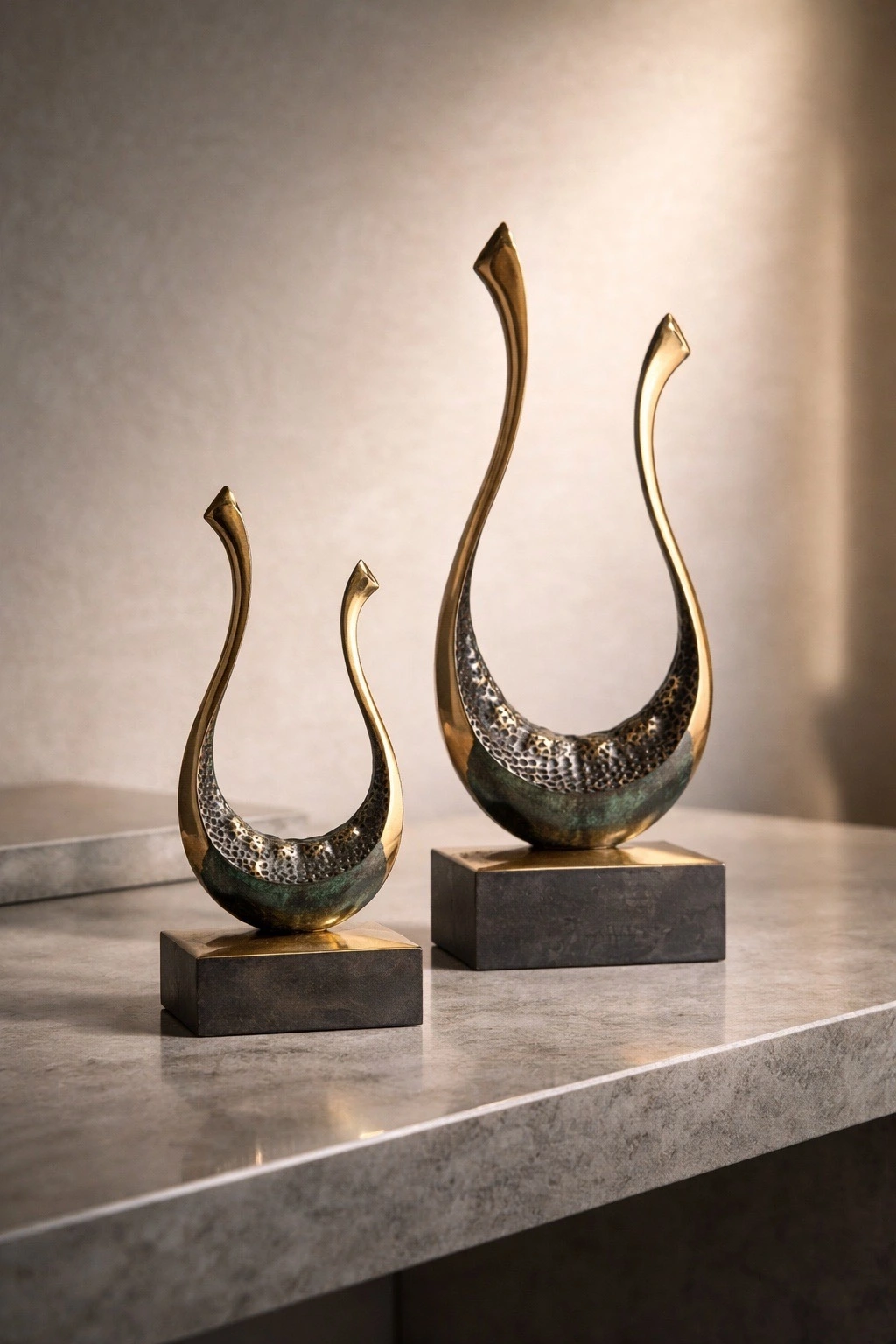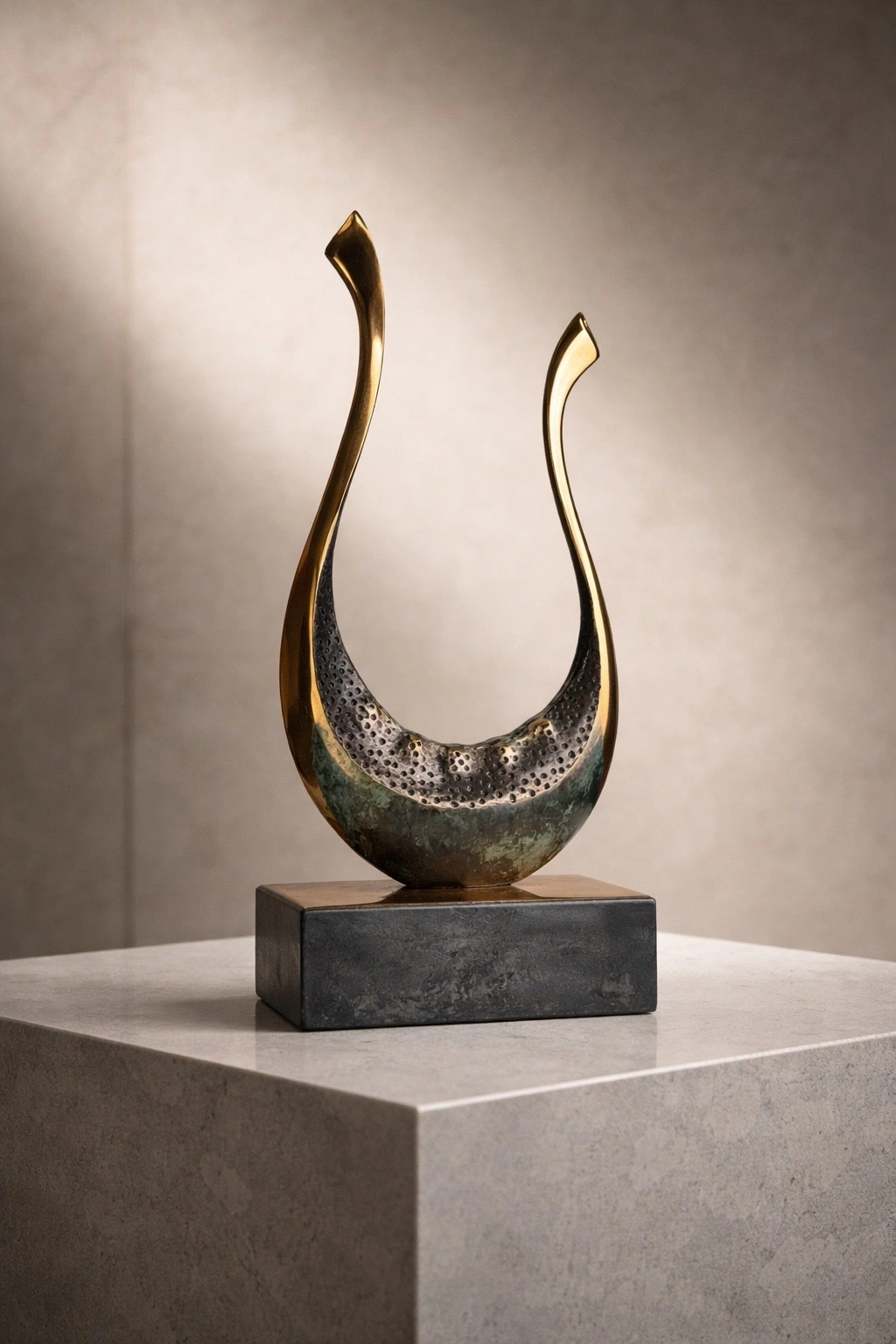 Det er lavet i massiv bronze som er patineret i flere nuancer med smukke, enkle, højpolerede detaljer.