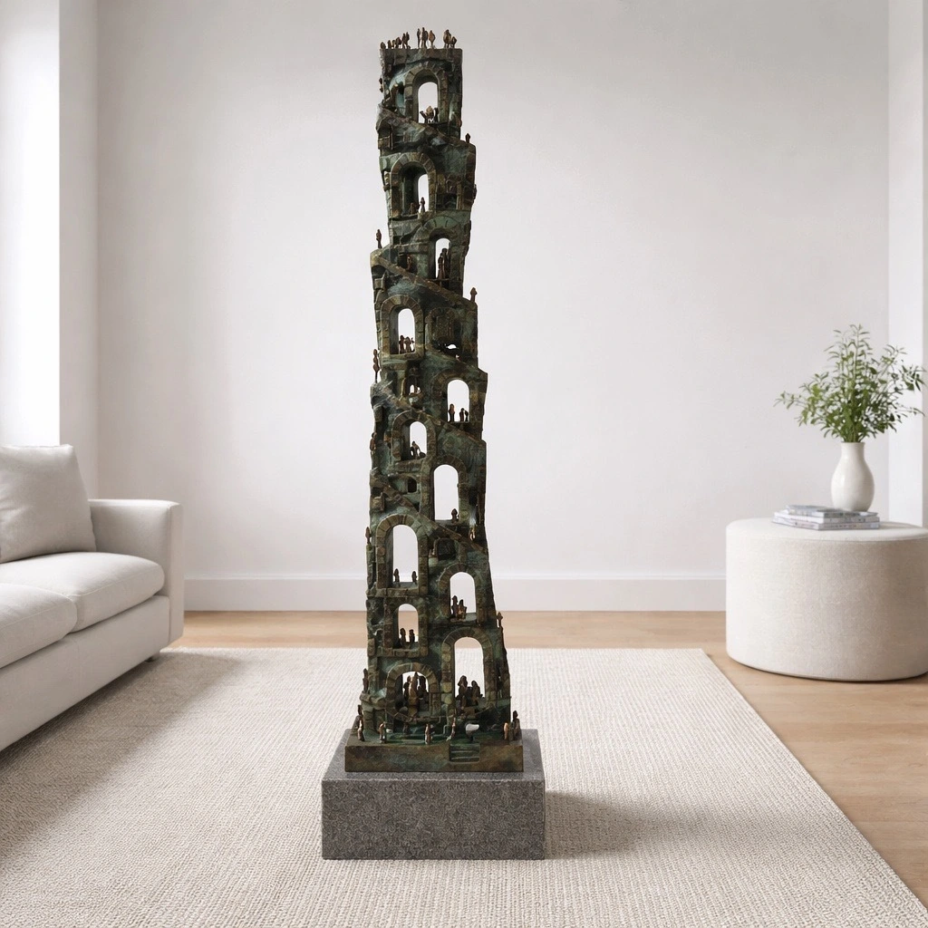 Skulpturen illustrerer hvordan mennesket i følge Bibelske fortællinger fra Første Mosebog kapitel 11, ønskede samme magt som gud og der var en gruppe mennesker, der begyndte at bygge et højt tårn i Babylon.